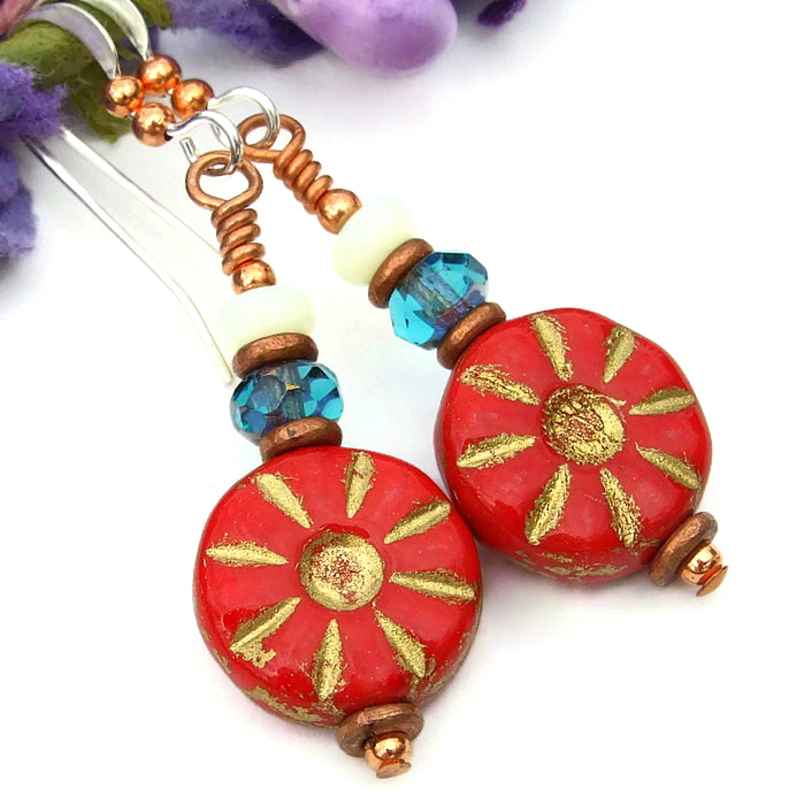 Red Flower Earrings Czech Glass Teal White Opal Handmade Jewelry Gift